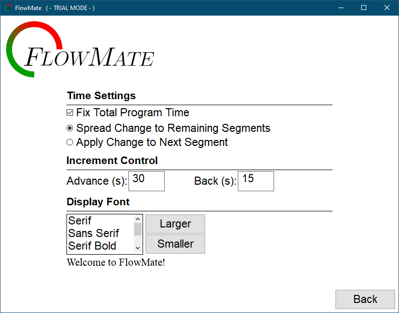 The content display font can be adjusted in this section, including the font face to use and the size. The example “Welcome to FlowMate” text will provide an example of how large normal text will appear in the content section when displaying a script; headings will be larger during display.